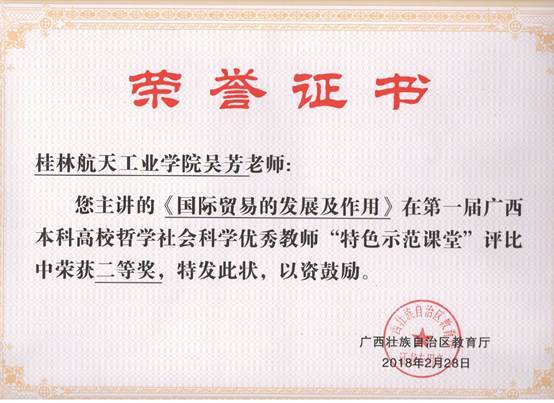 近日由教育厅获悉,我院推选参加广西本科高校哲学社会科学优秀教师“特色示范课堂”比赛的《国际贸易的发展及作用》课程喜获二等奖,此课程由国际商务教研室吴芳老师主讲。