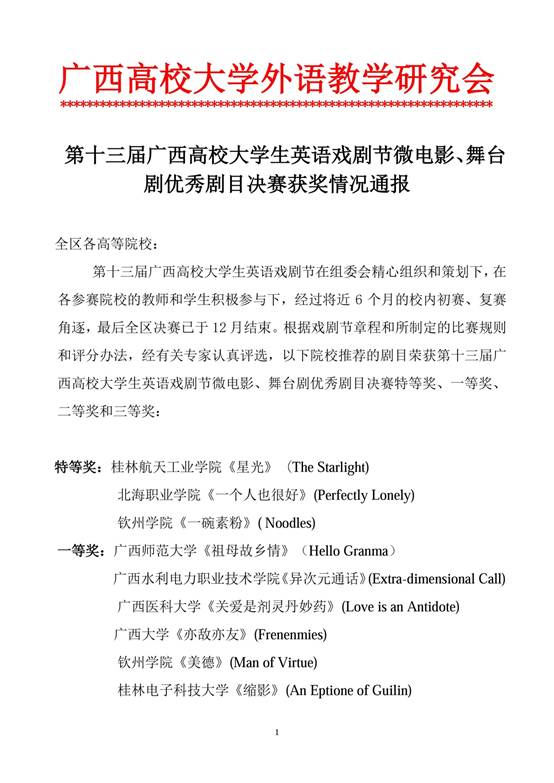 第十三届广西高校大学生英语戏剧节于近日落下帷幕,由我校推选的微电影作品《星光》(The Starlight)从众多高校的参赛作品中脱颖而出,以第一名的成绩荣膺特等奖。这也是我校继去年以第一名的成绩蟾宫折桂后,再次获此殊荣。