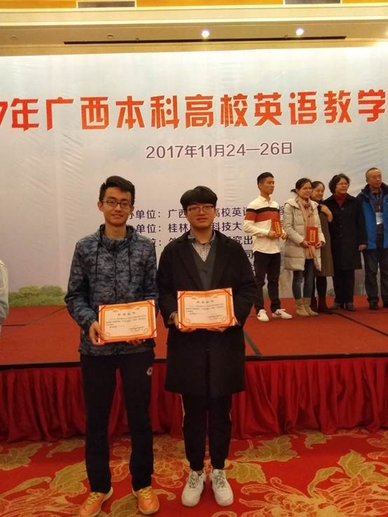 11月24日由广西教育厅主办的2017年广西本科高校大学生英语能力竞赛已圆满落幕。我校选手在比赛中再获佳绩:黄嘉琪和吴浩铭同学喜获非英语专业组二等奖,杨超同学荣获英语专业组三等奖。本次比赛全区共有30所高校,124名选手参加,旨在检验我区本科高校英语教学质量,全方位地展现我区大学生英语听、说、读、写、译的综合能力。